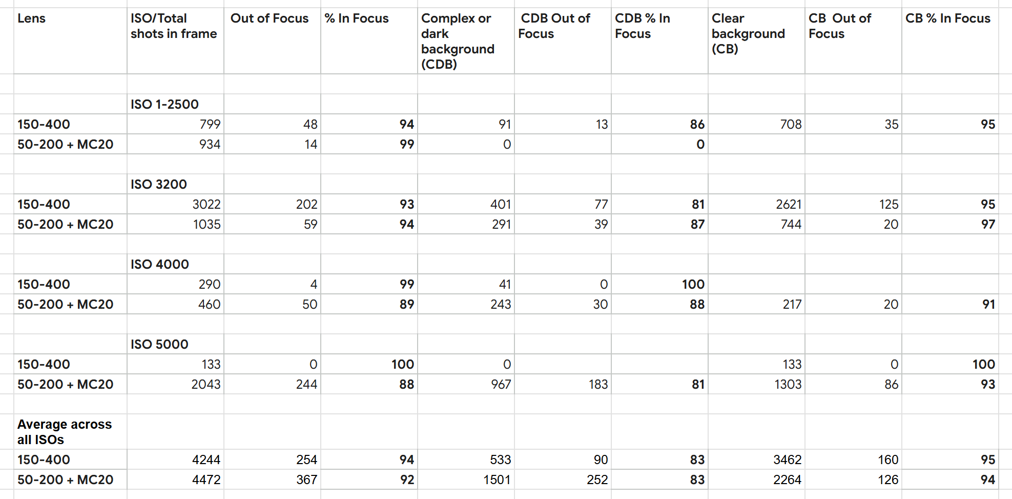 The data is subdivided by ISO and by the background type for each lens. If you look at the bottom three rows, you can see that 2000, or around half of the LW shots were taken at ISO 5000, and the average focus accuracy was lower, at 88%. But looking across the table, we can see that 1000 or so, or 25% of the LW shots were taken at this ISO against a complex or dark background (CDB). For these shots, the hit rate dropped to 81%. Against a clear sky, the hit rate shot up to 93%.